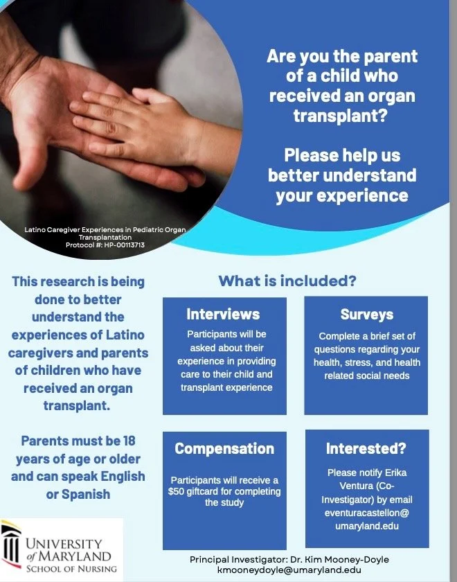 We are involved as a community partner in a few exciting research studies. We welcome your involvement right now in helping us find more Latino caregivers and parents of children who have received an organ transplant. The children must be receiving care in our region.